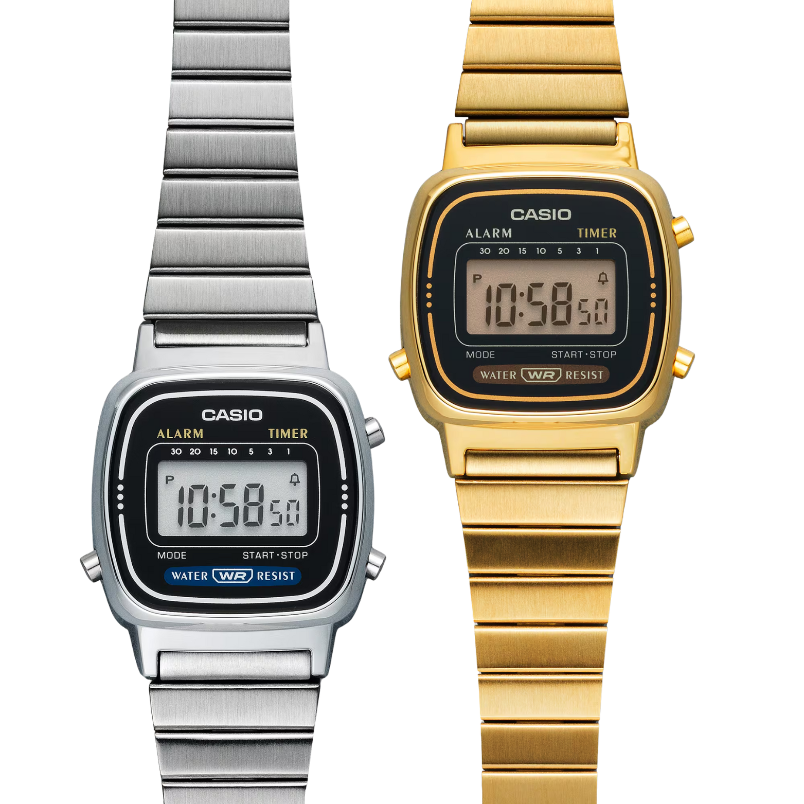 Elevate your everyday style with the CASIO LA670WGA-1, a timeless vintage digital women’s watch that seamlessly blends retro charm, modern functionality, and elegant aesthetics. Designed to complement both casual and dressy looks, this iconic model is a tribute to classic 1980s style — brought to life with a luxurious gold-tone stainless steel finish.