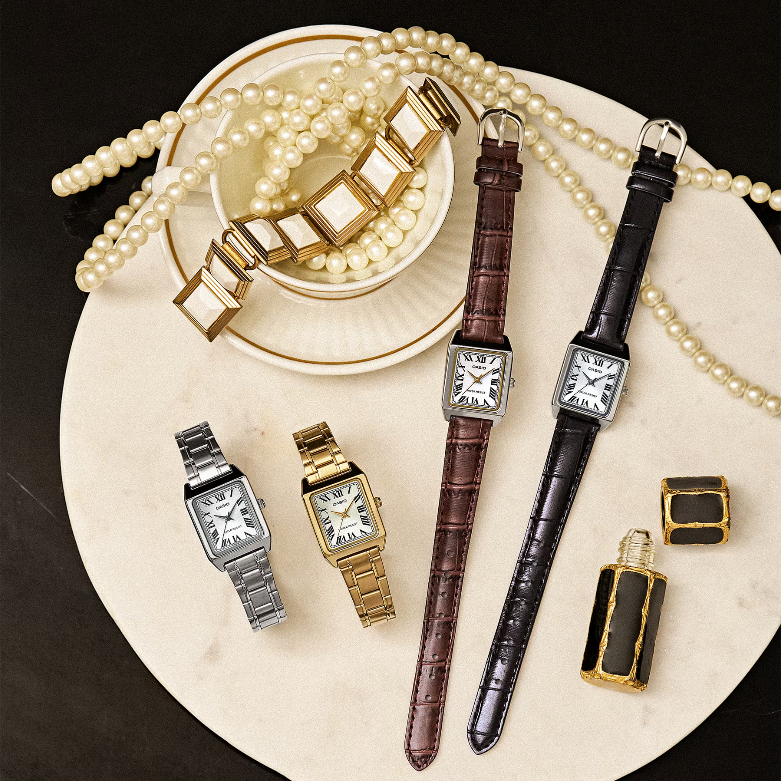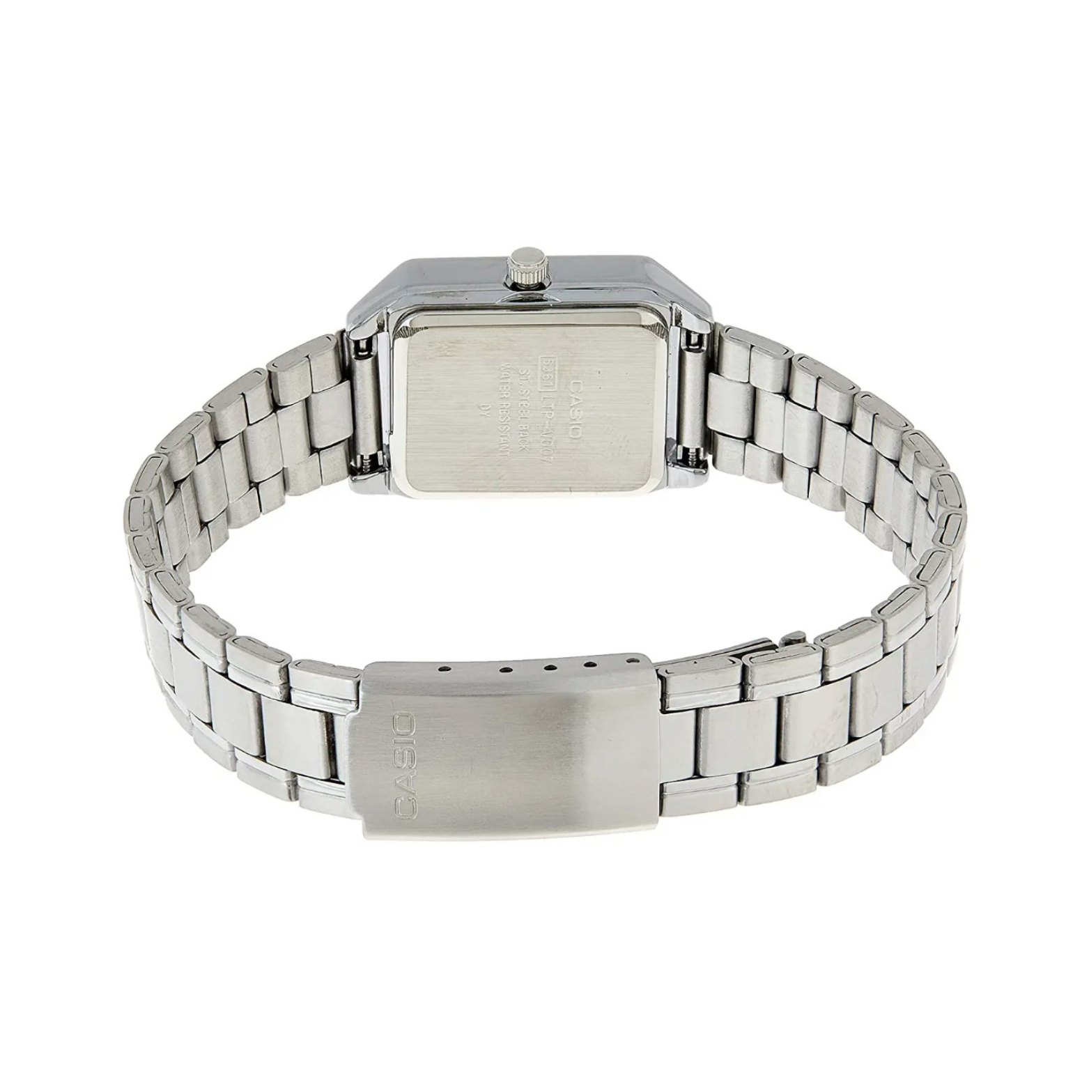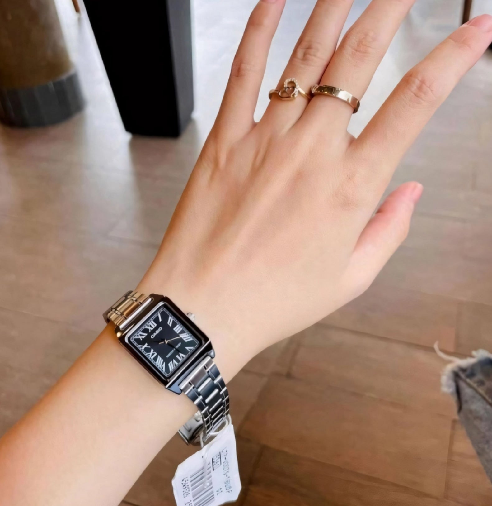Bring timeless elegance to your wrist with the CASIO LTP-V007D-1B—a classic vintage-style women’s watch featuring a sleek rectangular silver-tone case and a minimalist black dial. The polished stainless steel bracelet elevates any outfit, while reliable quartz movement, mineral glass, and daily water resistance make it perfect for everyday wear. If you’re looking for a small rectangular ladies’ watch that blends retro charm with modern durability, the LTP-V007D-1B is a chic, affordable choice.