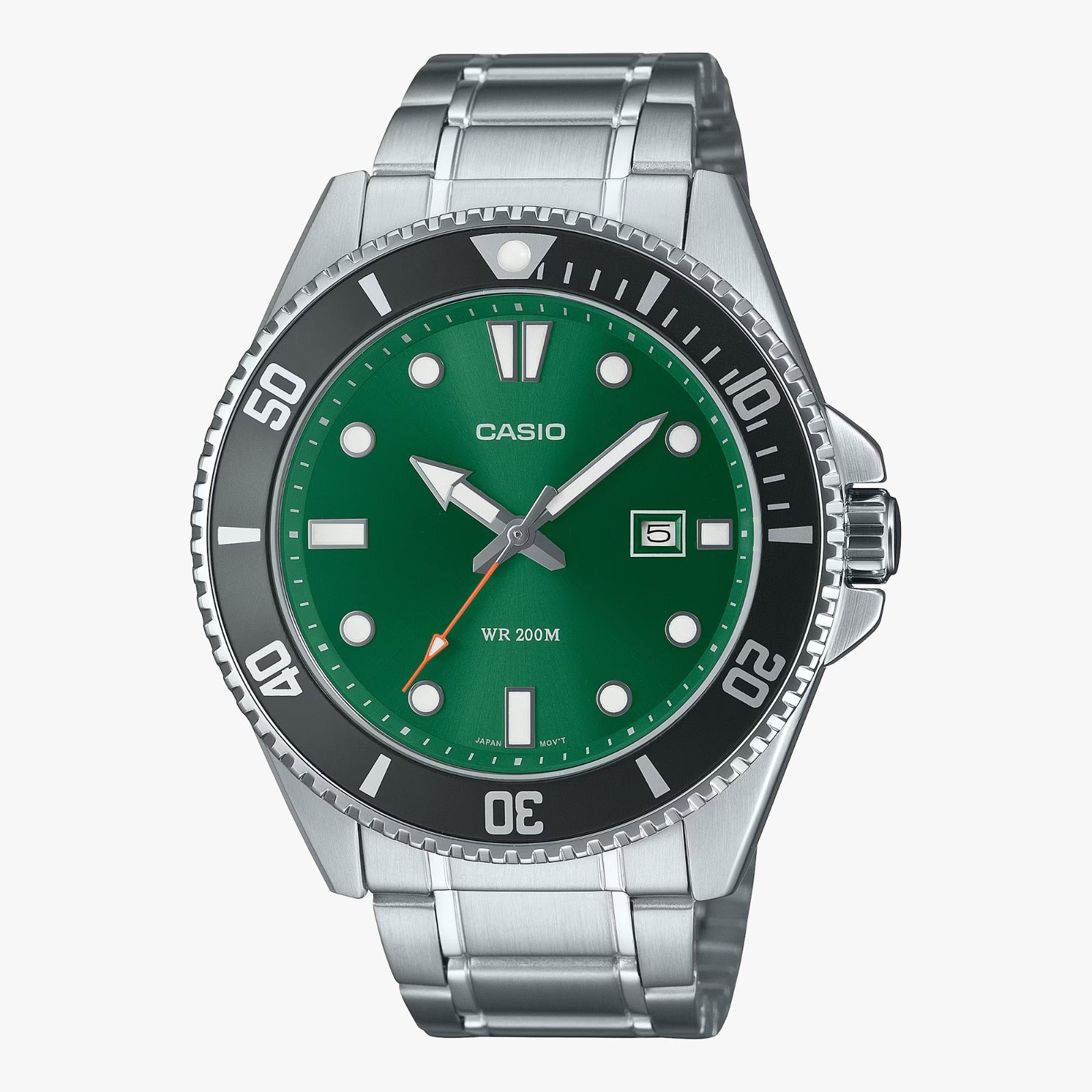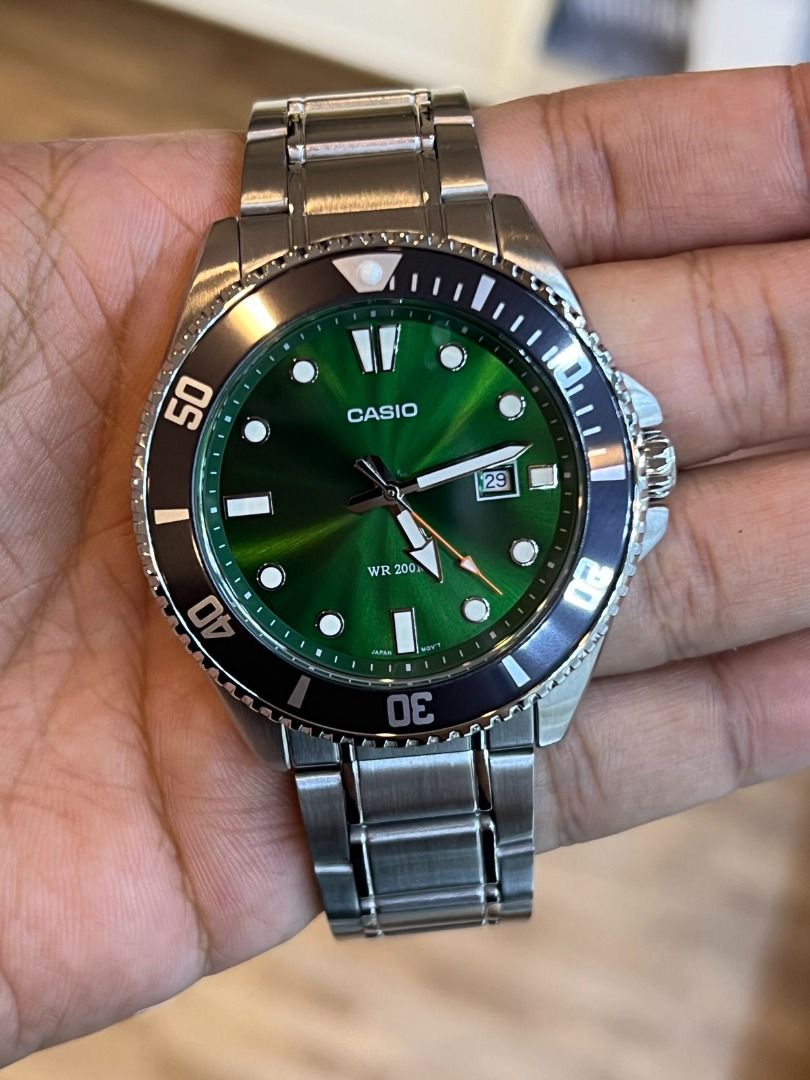 A CASIO analog watch with a green dial, stainless steel band, and date display.