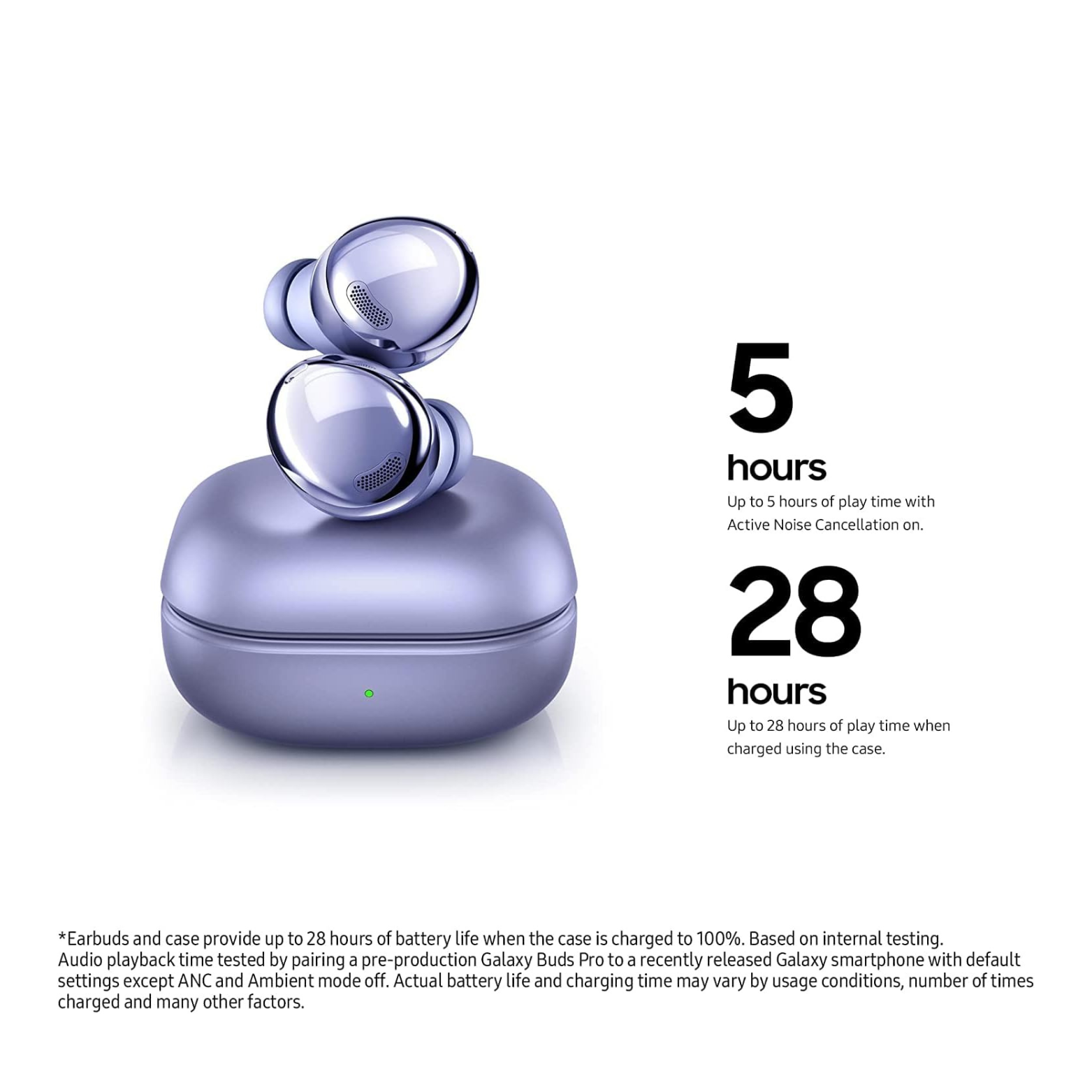 Intelligent Active Noise Cancellation: ANC & Bixby voice wake-up ON 4.5/16 hours, ANC or Bixby voice wake-up ON 5/18 hours, ANC & Bixby voice wake-up OFF 8/28 hours