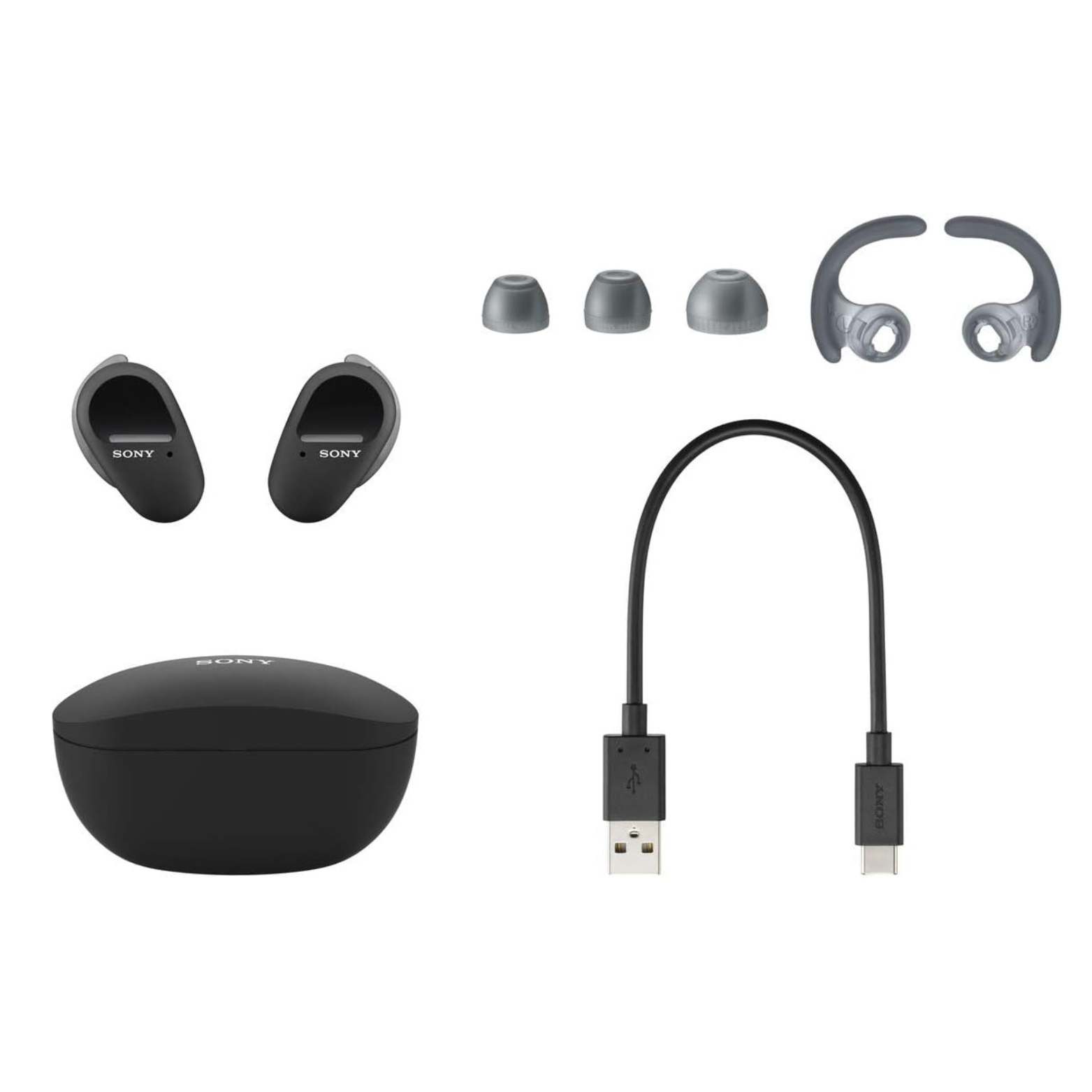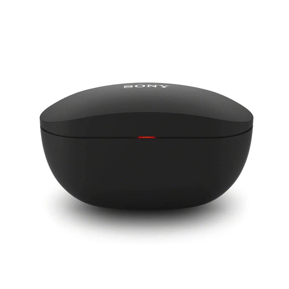 Black Sony wireless earbuds in a charging case on a white background