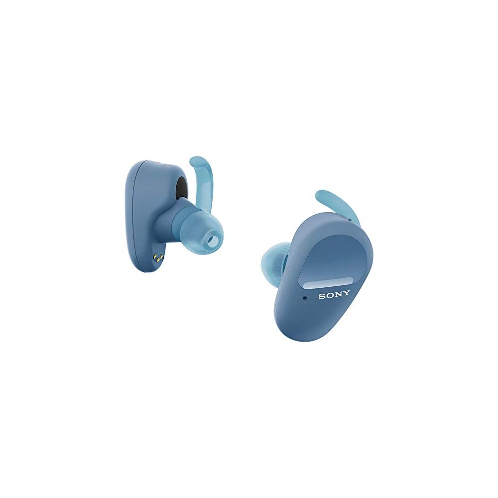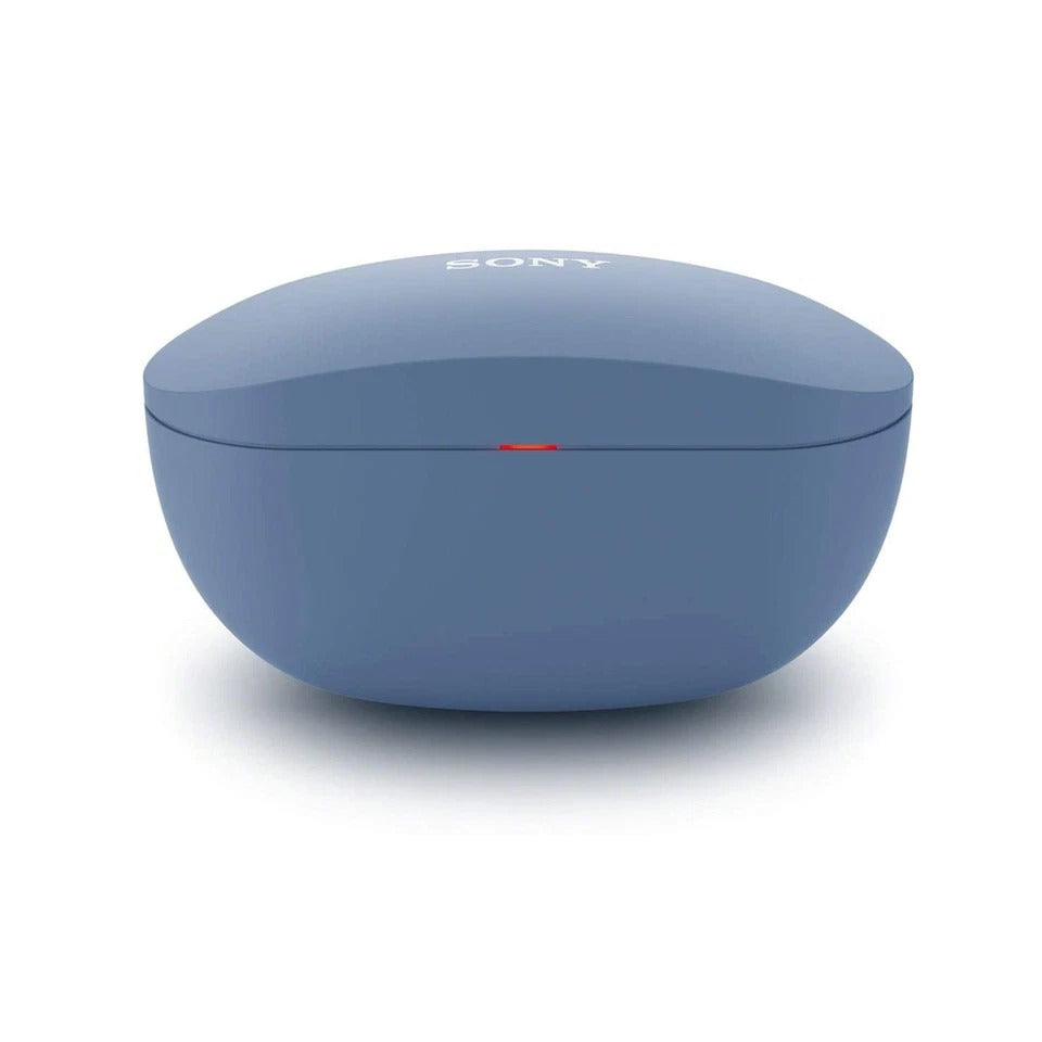Blue Sony wireless earbuds in a matching case on a white background