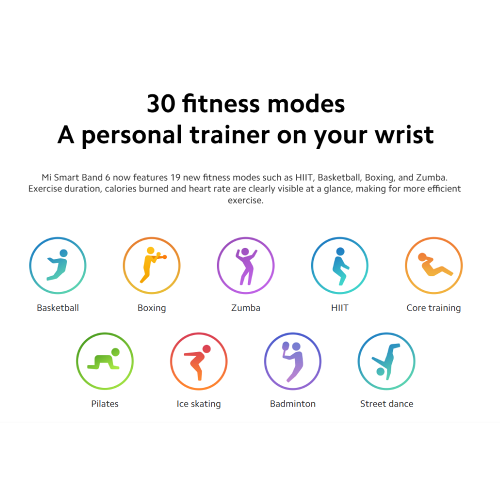 With 30 professional workout modes, including HIIT, swimming, yoga, and more, the Mi Smart Band 6 ensures accurate activity tracking for beginners and pros alike. Whether you're at the gym, on the trail, or working from home, it automatically detects 6 fitness activities to keep your progress in check.