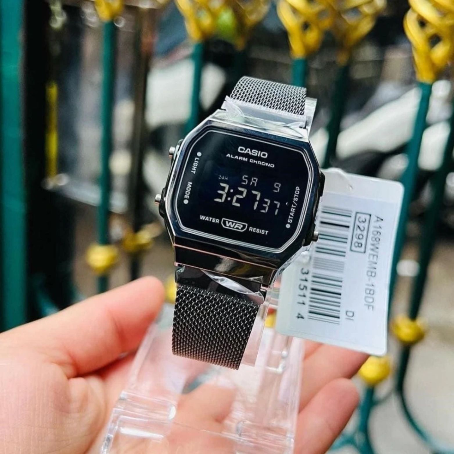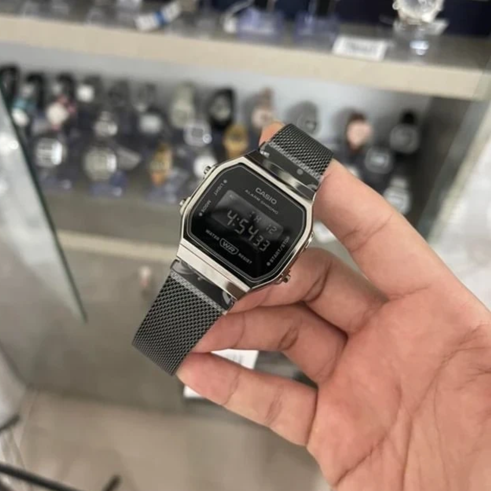 Minimalist, monochrome, and unmistakably retro—the CASIO A168WEMB-1BDF pairs a classic square digital face with a sleek black stainless-steel mesh bracelet. Practical everyday features—EL backlight, daily alarm, 1/100-sec stopwatch, auto-calendar, and 12/24-hour formats—meet a water-resistant build and dependable quartz accuracy. A unisex vintage staple that slips effortlessly from casual to smart.