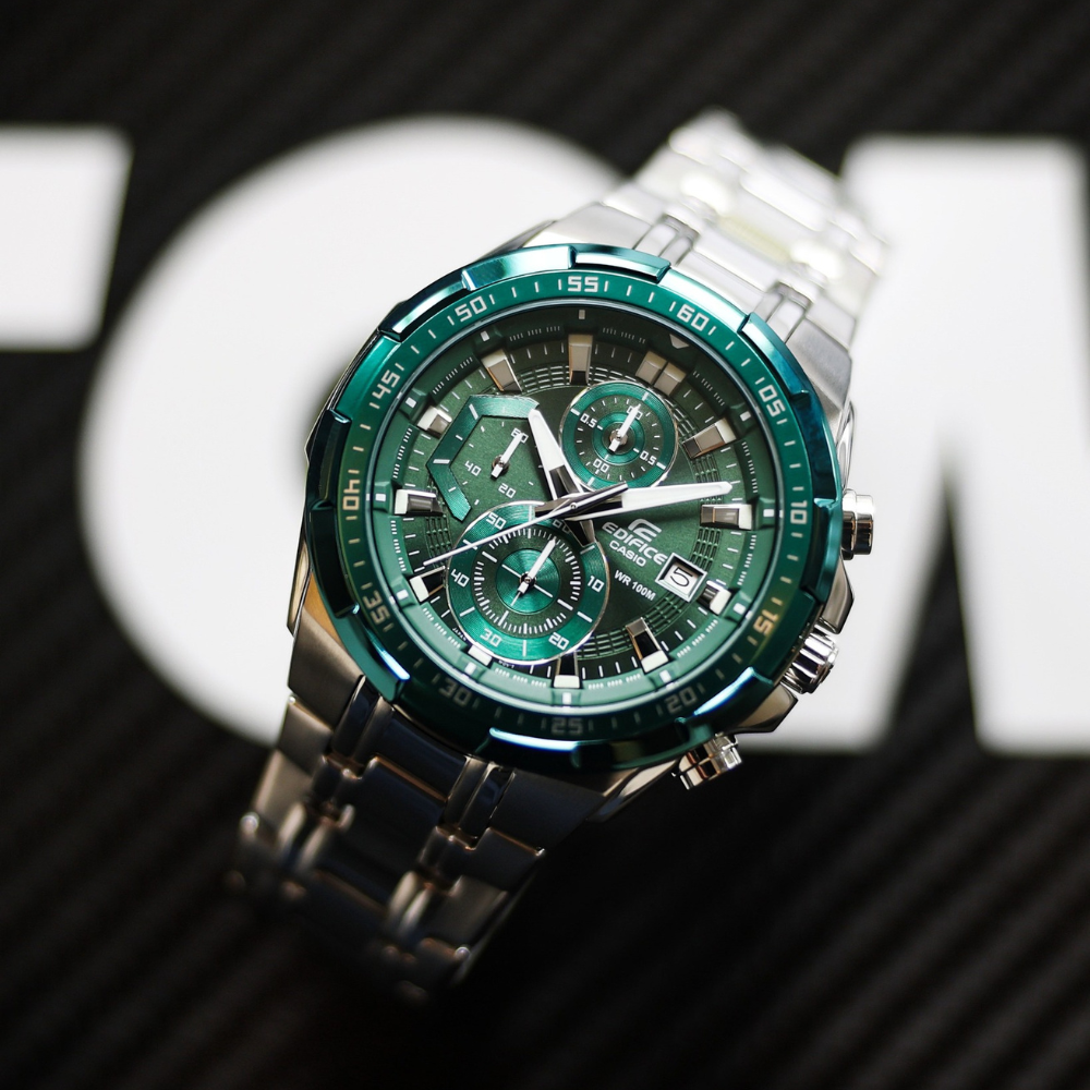 Built for bold style and everyday performance, the CASIO Edifice EFR-539DE-3AVUDF pairs a striking green sunray dial with a solid stainless-steel case & bracelet. The oversized sport profile houses a multi-subdial chronograph for precise timing, plus a date window for daily convenience. With 100 m water resistance, durable mineral glass, and dependable quartz accuracy, this Edifice is ready for office, weekend, and after-hours.