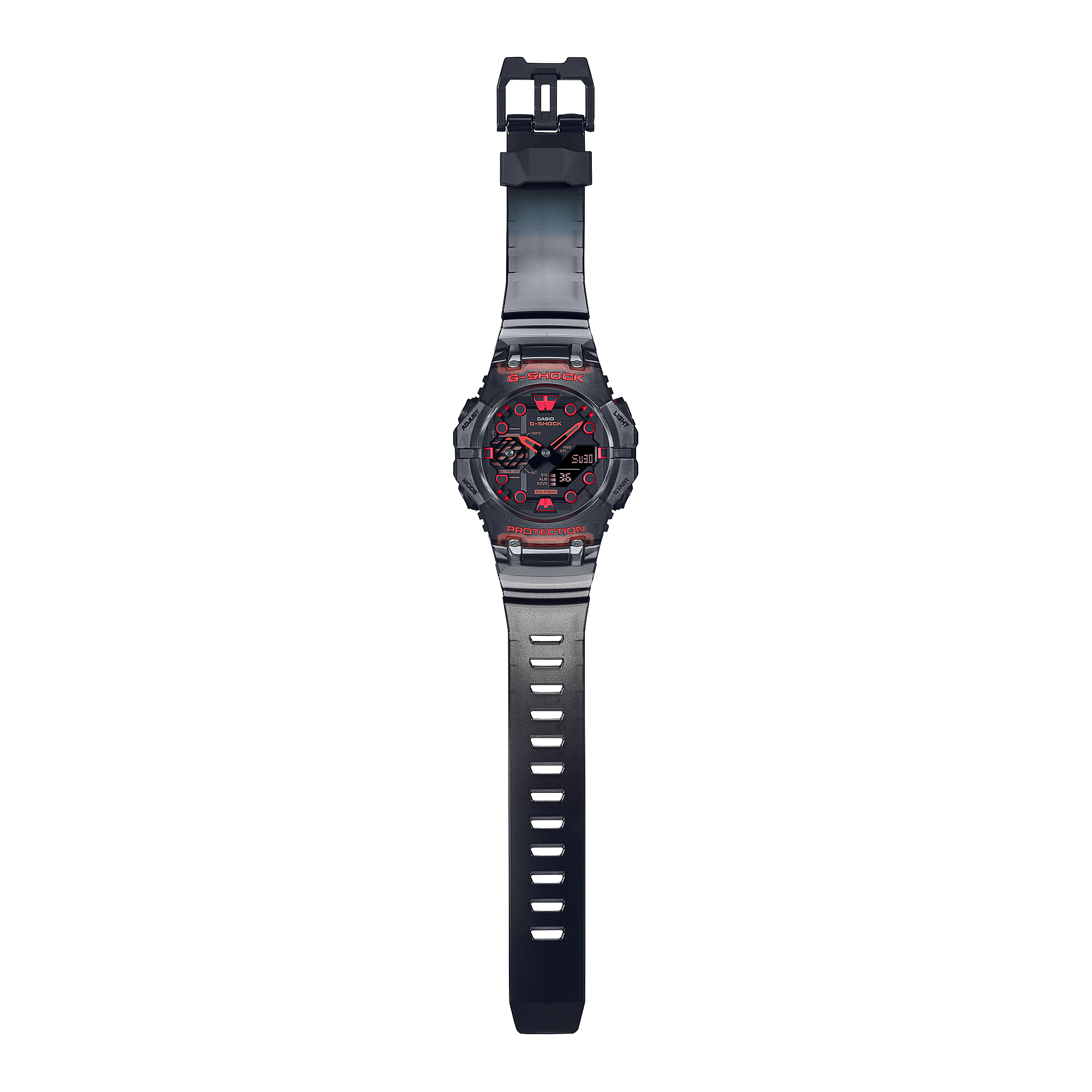 The GA-B001G-1ADR features a transparent black resin case and band, giving it a unique, modern aesthetic that stands out from traditional designs. The Carbon Core Guard structure enhances strength while maintaining a lightweight profile. Built for all conditions, it’s shock resistant and 200M water resistant, making it perfect for everyday use, workouts, and outdoor adventures.