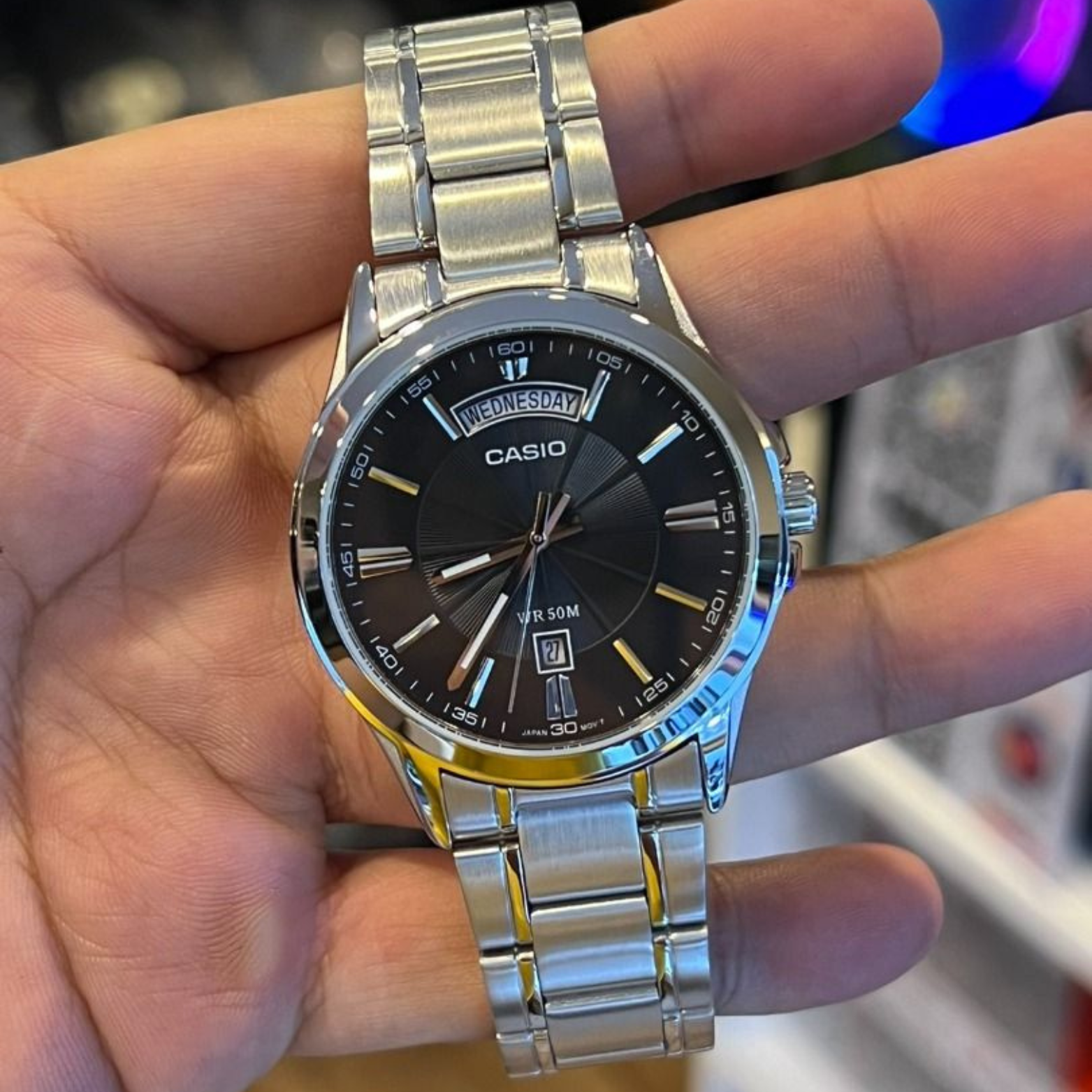 Classic style meets everyday utility in the CASIO MTP-1381D Series. These men’s analog watches pair a polished stainless-steel case and bracelet with a refined dial featuring Roman numerals, a prominent day indicator, and a convenient date window. Protected by mineral glass and rated 50m water resistant, the series delivers dependable quartz accuracy and versatile looks for office, weekend, and formal wear.