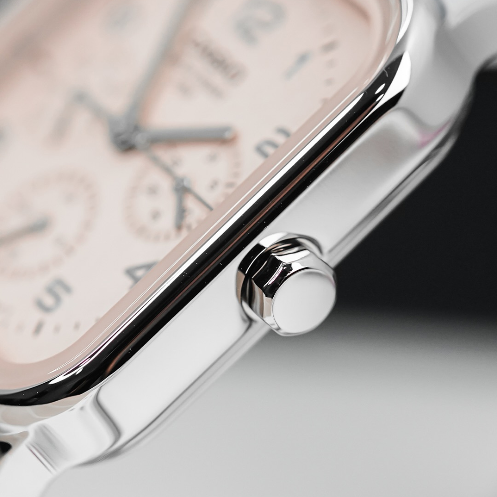 Elegant pink dial with three subdials for day, date, and 24-hour time