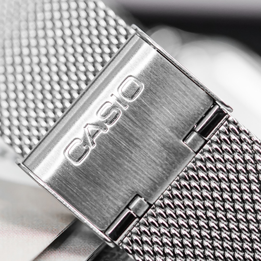 Stainless steel case with slim stainless steel mesh band and adjustable clasp for a modern, comfortable fit