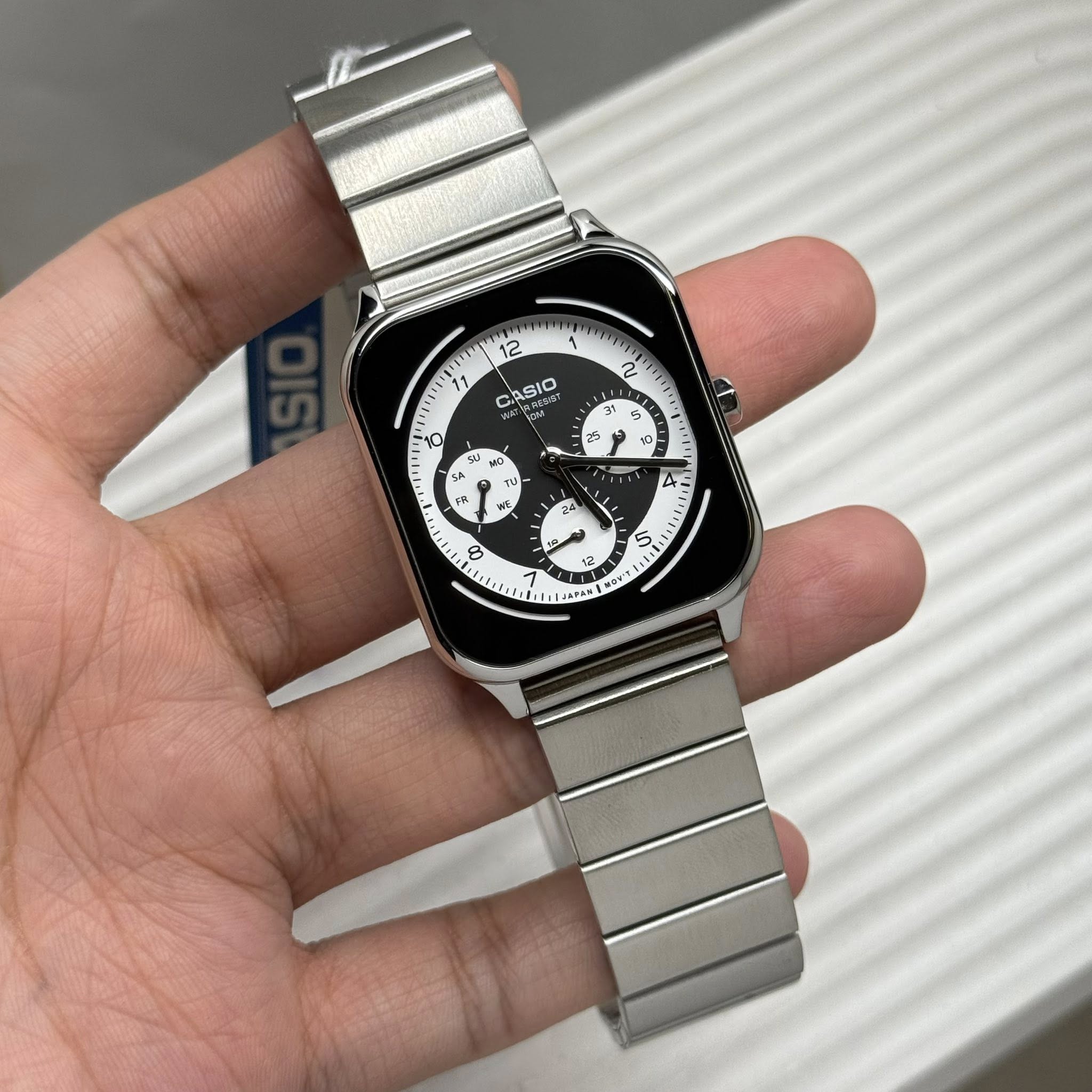 The Casio MTP-M307D-1BVDF is a modern men’s analog watch that combines a bold black dial with practical multi-function design. Three inset subdials display the day, date, and 24-hour time, giving you key information at a glance. The stainless steel case and bracelet with a one-touch 3-fold clasp offer a secure, comfortable fit and a polished look that works perfectly for office, casual, and evening wear. With 50-meter water resistance, mineral glass, and reliable quartz movement with approx. 2-year battery life, this watch is built for everyday use while keeping your style sharp.