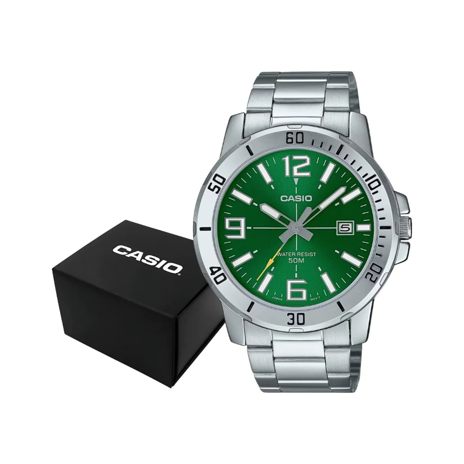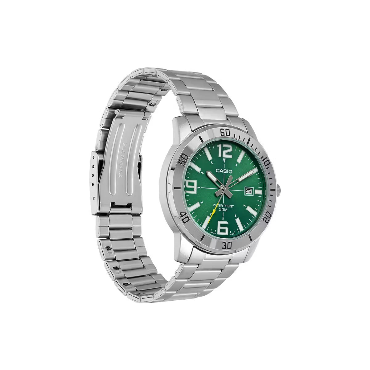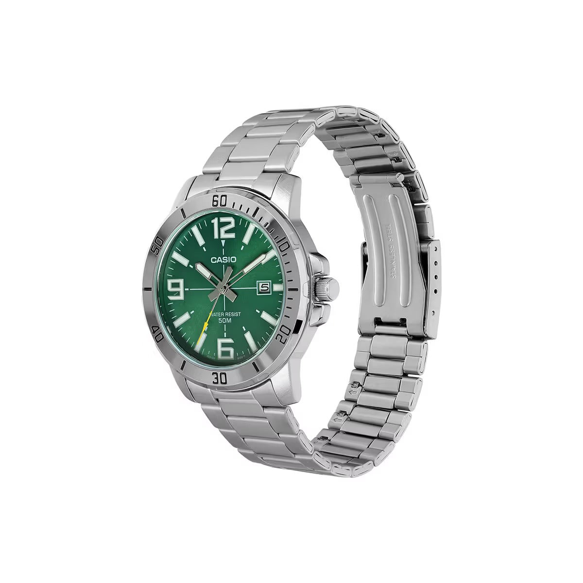 Step up your wrist game with the Casio MTP‑VD01D‑3BVUDF, part of Casio’s Standard / MTP‑VD01D line. This model features a rich green dial, a sturdy stainless steel case and band, and essential functionalities—perfect for everyday use with a dash of personality.