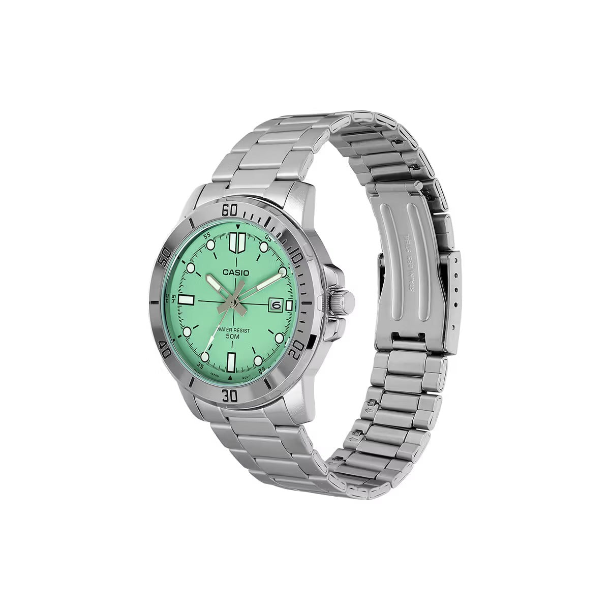 Men’s analog stainless steel watch, 50m water resistant Casio, Date display analog watch, Quartz men’s wristwatch, Mineral glass Casio watch, Metal bracelet Casio watch, Classic everyday timepiece Casio