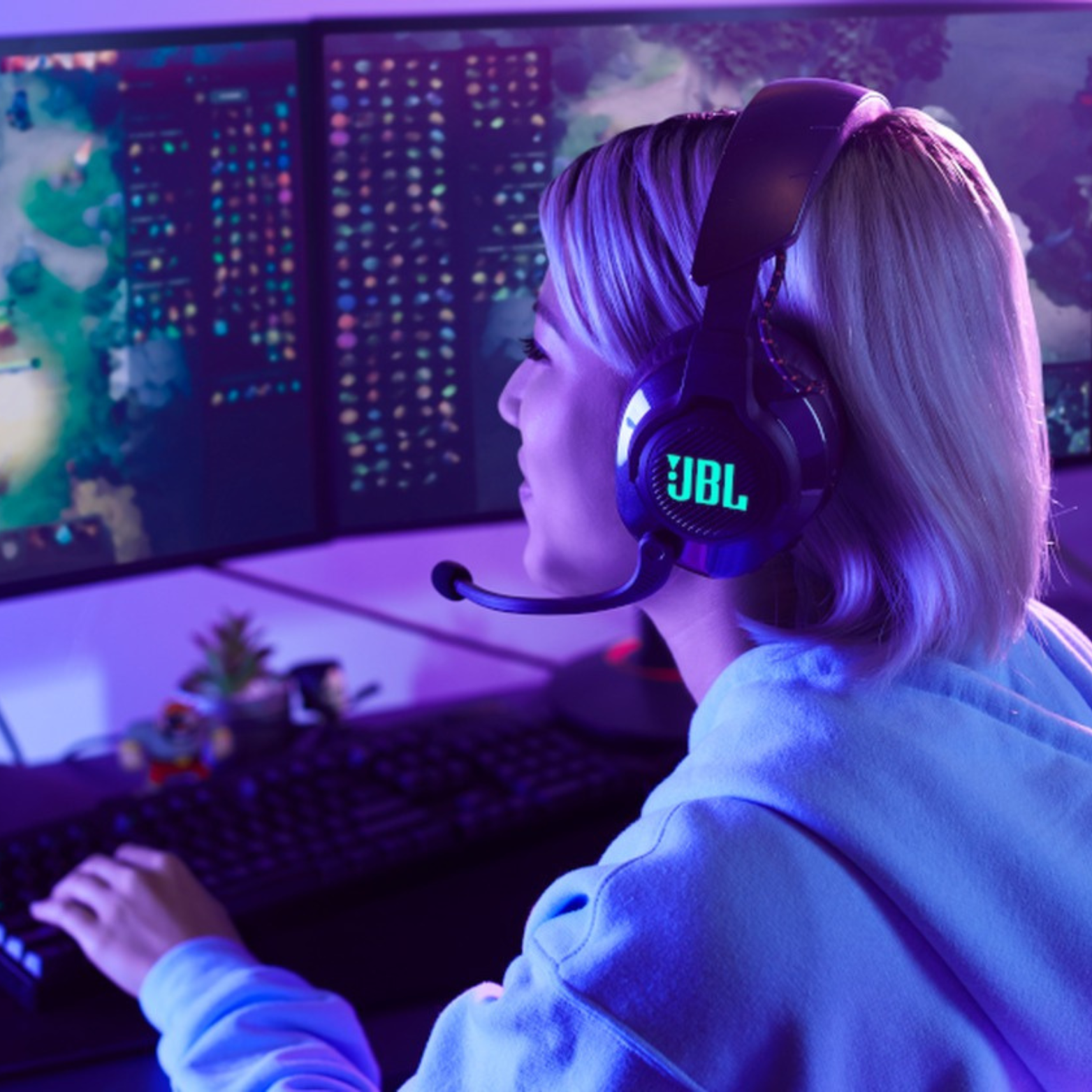 It's time to level up with the JBL Quantum 610 Wireless. JBL QuantumSURROUND delivers a fully immersive experience. And the 50mm drivers powered by JBL QuantumSOUND SIGNATURE make every moment epic, whether you're on a stealth mission or in the heat of a massive battle. Your voice will sound loud and clear with the flip-up boom mic, and you can plot and strategize with your team on DISCORD, Skype, and TeamSpeak. Enjoy longer gameplay with 40 hours of battery life, or plug in for endless sessions with the USB charging cable.