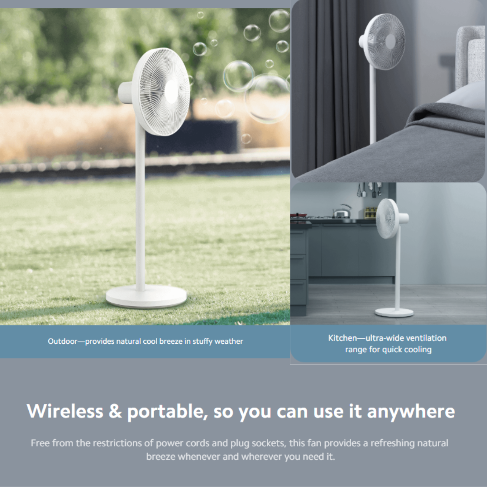 It features a 140° ultra‑wide ventilation range reaching up to 14 metres, perfect for room‑wide air circulation. The fan supports floor or desktop use, has 100 precise speed settings, and a built‑in lithium battery giving up to ~18 hours of cordless operation in lower modes — making it ideal for power outages or portable use.
